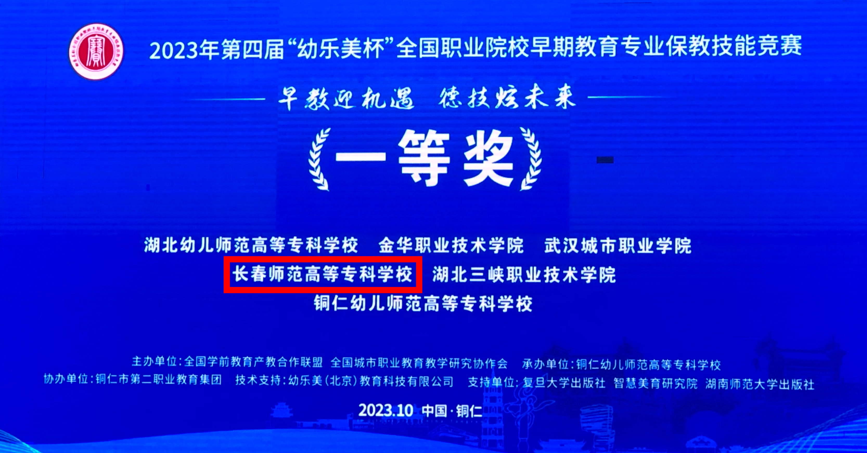 早教迎机遇,德技炫未来。10月21日至23日,第四届“幼乐美杯”全国职业院校早期教育专业保教技能大赛在贵州铜仁举行,共25个省207名选手同台竞技。经过激烈角逐,公司参赛选手早期教育专业21级3班刘可欣、孙楚涵、22级2班李洪娟以娴熟的专业技能和完美的现场展现傲压群雄,获得团体一等奖,在69支代表队中排名第四。创下吉林省参与该项赛事的最好记录,取得了历史性新突破!